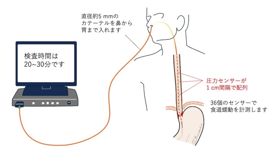 高解像度食道内圧検査(ハイ・レソリューション・マノメトリー[High-Resolution Manometry:HRM])は食道の圧力や蠕動運動を計測する検査です。この検査によってさまざまな食道運動機能障害の病気を診断することができます。GERDは、LES圧が下がったり、食道運動機能障害があったりすると重症化しやすいので、この検査はGERDの病態評価に有用です。欧米を中心に普及しております。検査は鼻から細長い管(直径約5.5 mm)を食道に留置して圧センサーによって嚥下(飲み込むこと)中の食道運動機能を調べます。(写真2)